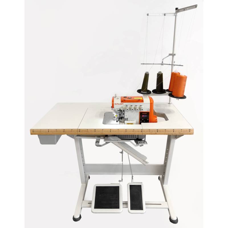 Owerlok 2-igłowy / 4-nitkowy [typ ściegu 514], rozstaw igieł 2 mm, szerokość obrzucania 5 mm, transport dolny ząbkowy - zróżnicowany, maksymalna prędkość szycia 7.500 ściegów/min, centralne smarowanie. Do szycia materiałów lekkich i srednich. Maszyna kompletna: głowica, silnik, podstawa, blat. Zasilanie 230 volt silnik energooszczędny w głowicy.