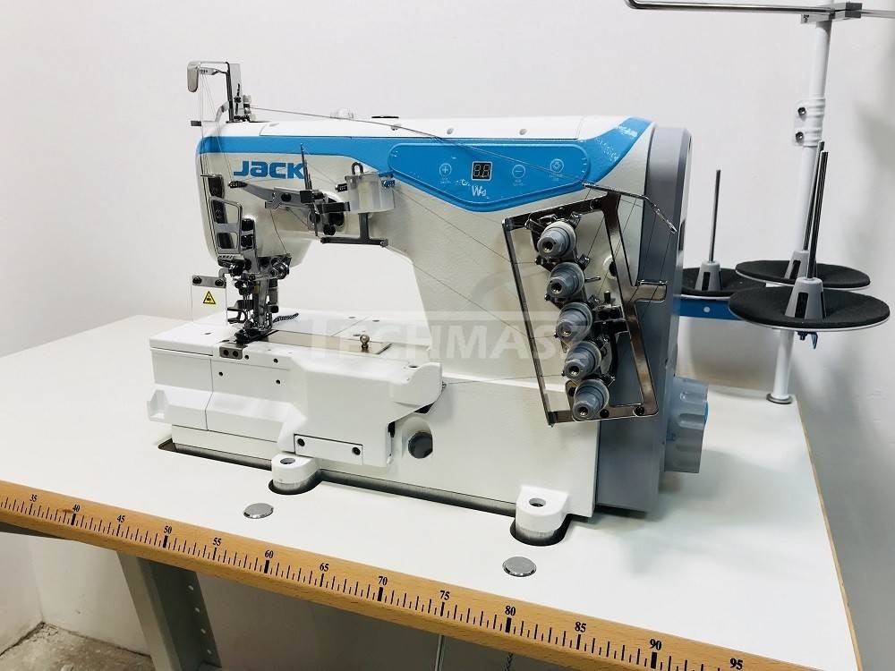 Maszyna drabinkowa renderka 3- igłowa ze zintegrowanym silnikiem energooszczędnym servo, łoże płaskie, z dolnym i górnym przeplotem, przeznaczona do podwijania dołów w bluzkach i podkoszulkach z dzianiny, lamowania (potrzebny lamownik), rozszywania szwów owerlokowych, ozdobnego przeszywania i wielu innych operacji.