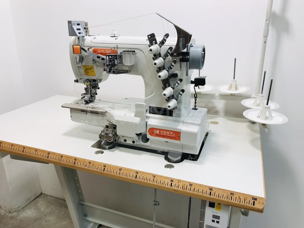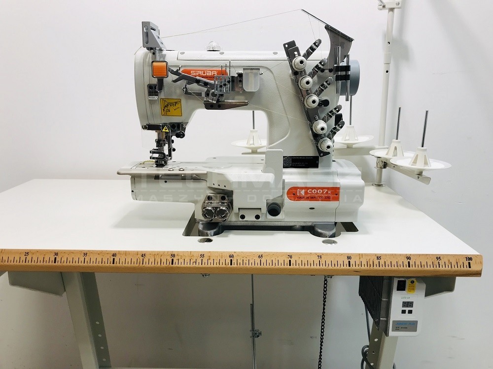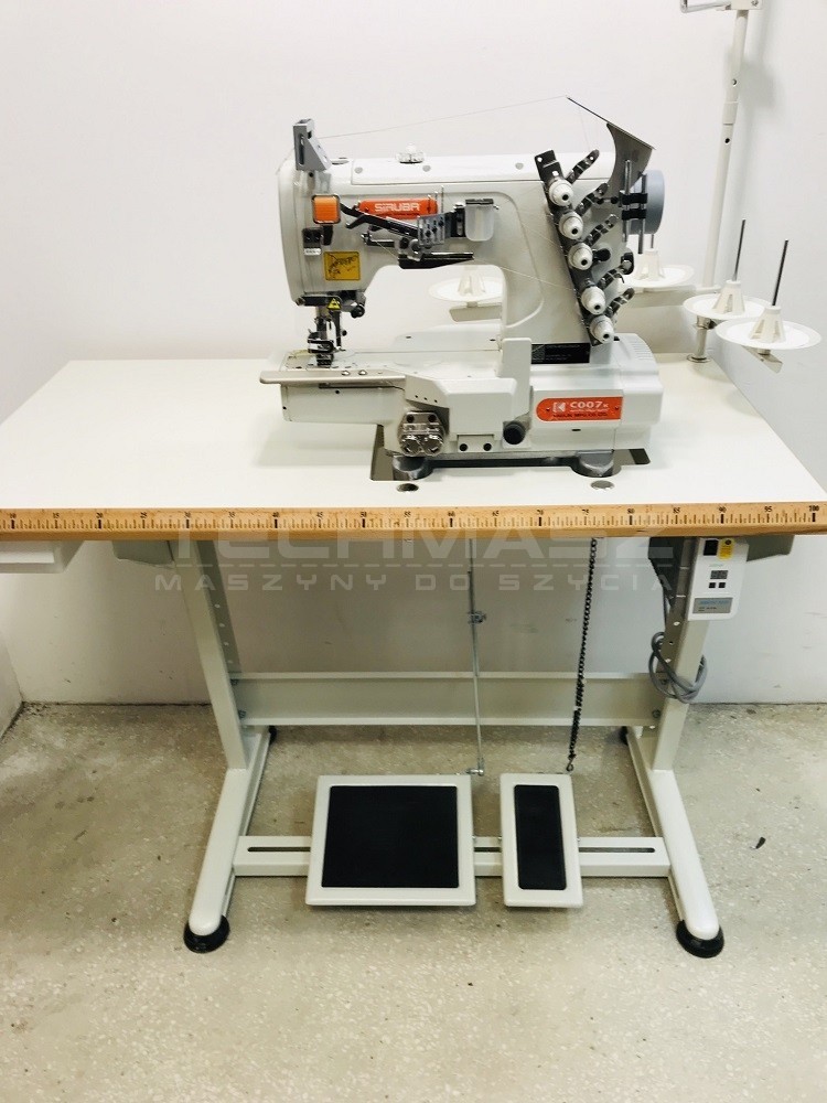 Maszyna drabinkowa 2- lub 3- igłowa, łoże cylindryczne, z dolnym i górnym przeplotem, 6000 ściegów/min, centralne smarowanie, dostępne rozstawy dla dwuigłówek: 4,0; 4,8 mm, dla trzyigłówek 5,6mm i 6.4 mm, możliwość wyłączenia górnego przeplotu, standardowo wyposażona w linijkę do podwijania, dodatkowo może być wyposażona w transfer do rozszywania szwów owerlockowych, lamowania, wszywania gumy itp.