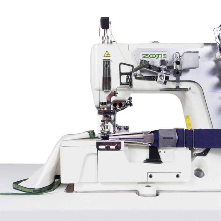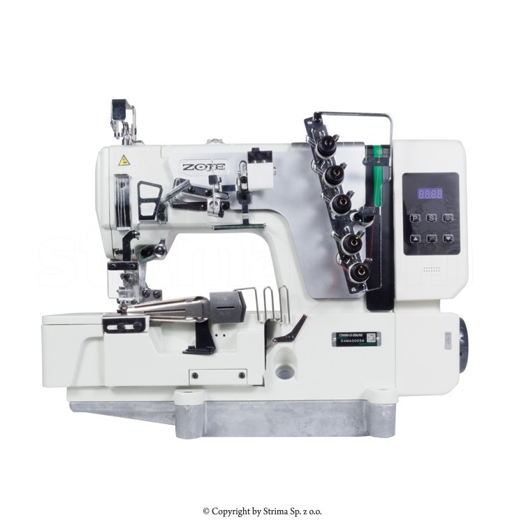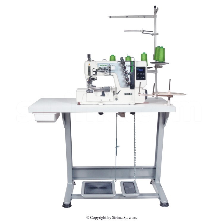 ZOJE C5000-G-364-02 SET to 3-igłowy, 5-nitkowy interlok z płaskim łożem, wyposażony w transport dolny różnicowy i automatyczne pozycjonowanie igieł. Wyposażony w kompletny przyrząd do lamowania. Maszyna znana też jako kapówka albo renderka.